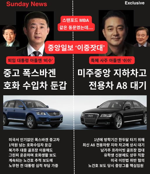 ‘같은 스탠퍼드 MBA 동문인데… 노건호는 중고 폭스바겐 타면 부정축재고, 홍정도는 학생 신분에 LA 내려오면 상무님에 전용차 A8에 프라이빗 골프장 접대 받는 건 당연한 특혜냐? 정권만 바뀌었지, 중앙일보도 다를 게없구나.’